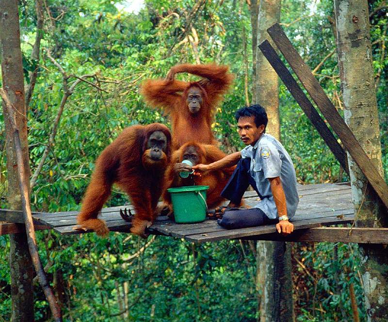 If it had been viewed orangutan were swinging freely at the top of the tree, it turns out you can be closer to them. Each morning at 8:30 and 15:00, the guards will give dining area orangutans at the feeding station, then we can go try to feed the orangutan.
